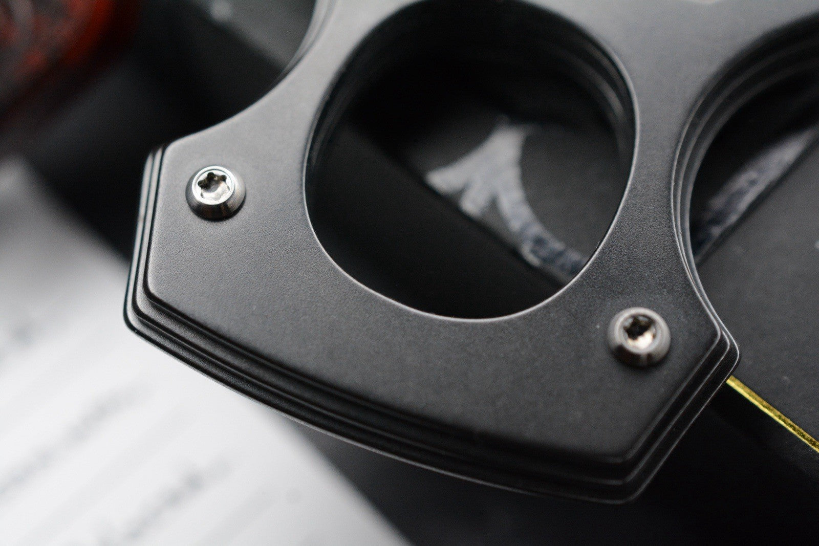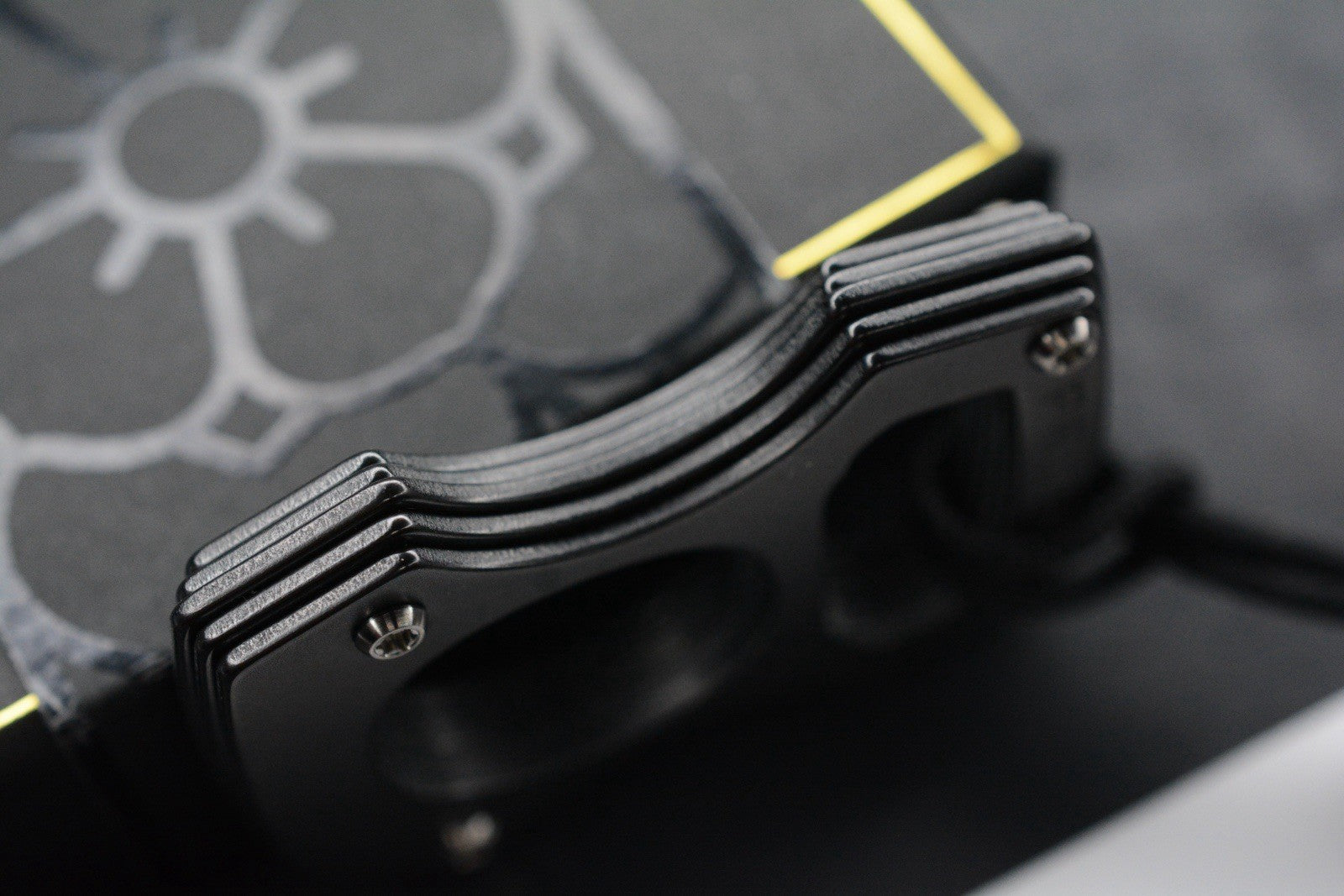 Each Cypop in this Art Deco-inspired series was created from 5 laser-cut pieces that have been individually finished and then assembled with titanium hardware into a .312 (thick) Cypop. The stacked pieces of material are different sizes, giving the finished Cypop a tapered edge and Pat's recognizable style.