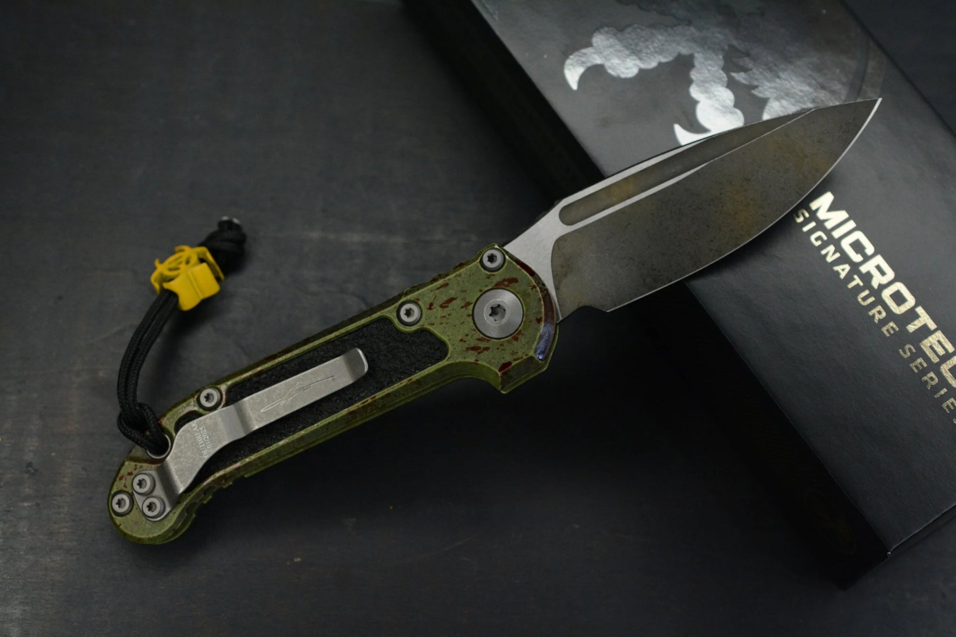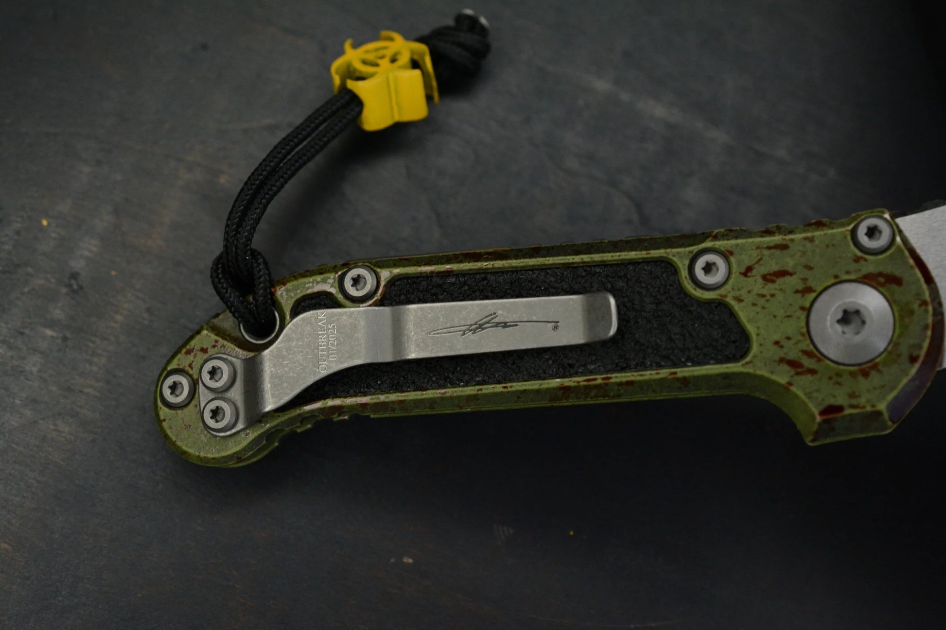 This ultimate collector piece from Microtech in the super iconic Outbreak style comes with a matching hand painted yellow radioactive bead