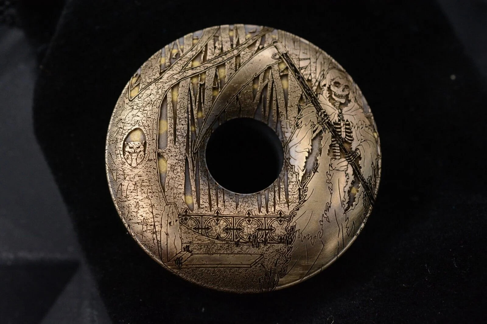 Machined from solid brass , the GrimNutz features a beatifully brooding Grim Reaper artwork, and will patina beautifully with time and use. If you're looking for the ultimate fidget tool that provides a tactile experience unlike any other – this donut takes the cake.