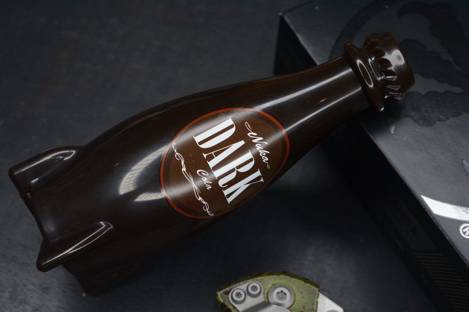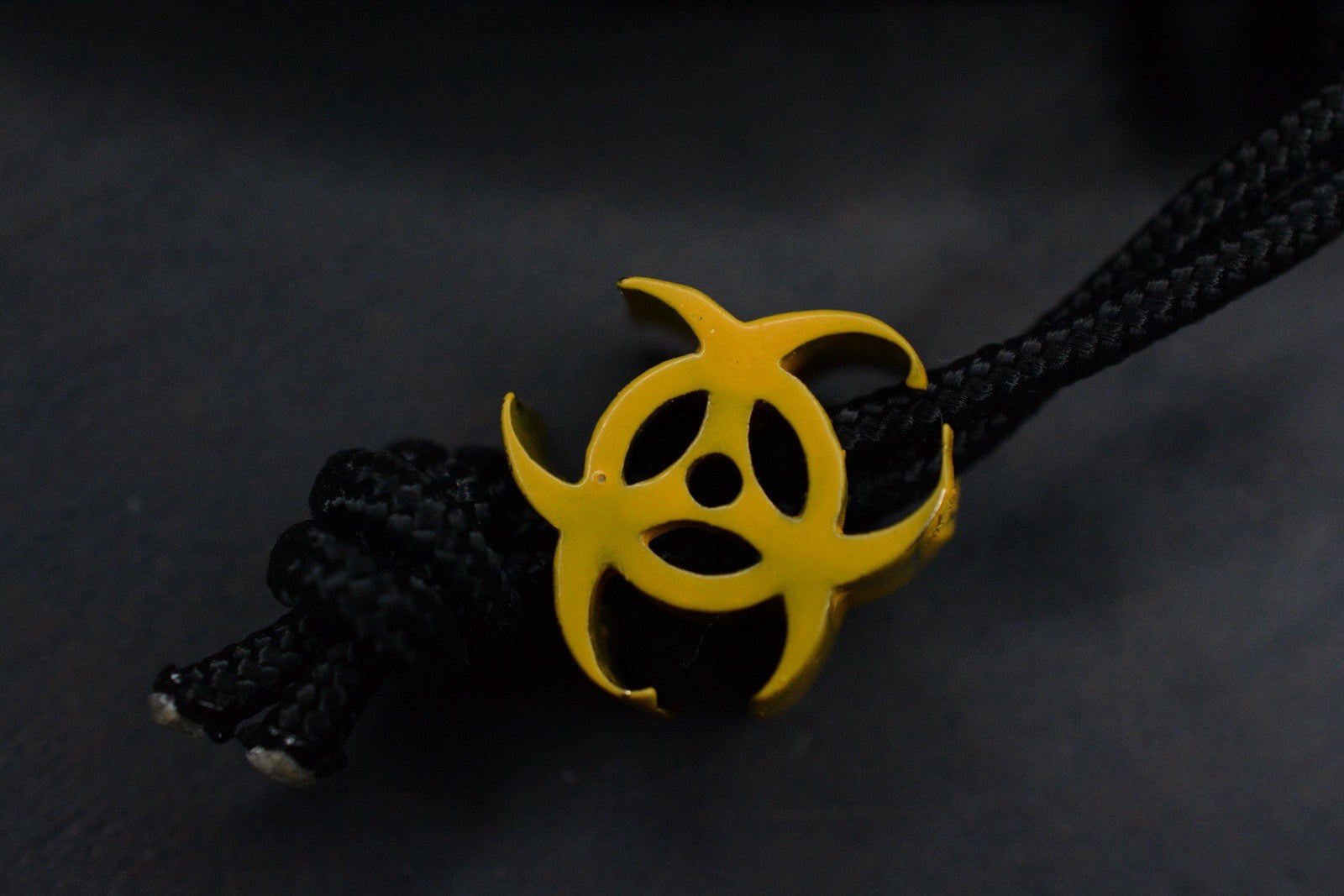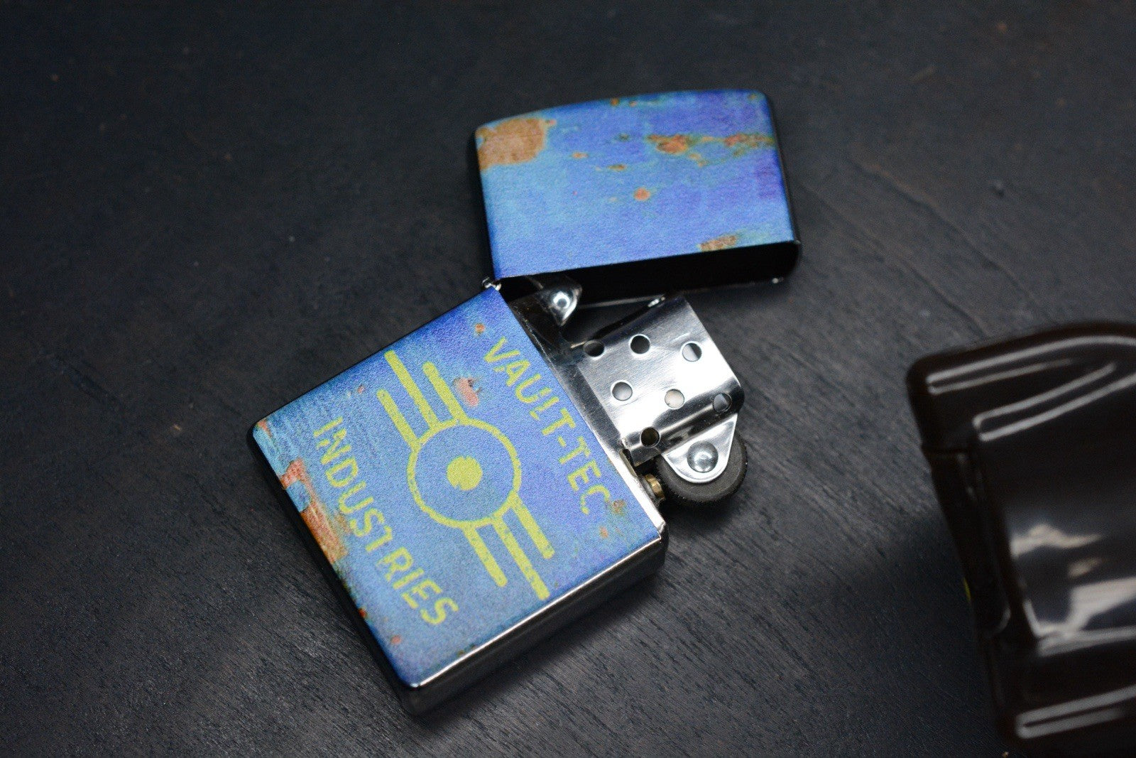 A hand painted biohazard bead screams Fallout like no other. Also included is a Vault Tec lighter as well as an official Nuka Cola light up bottle statue