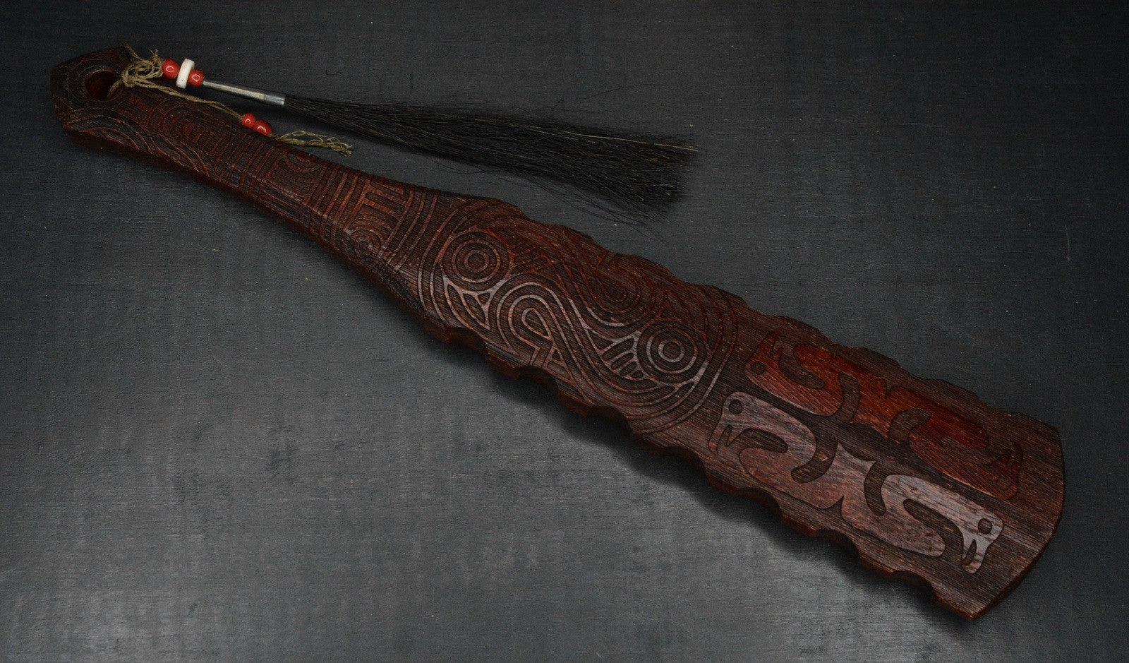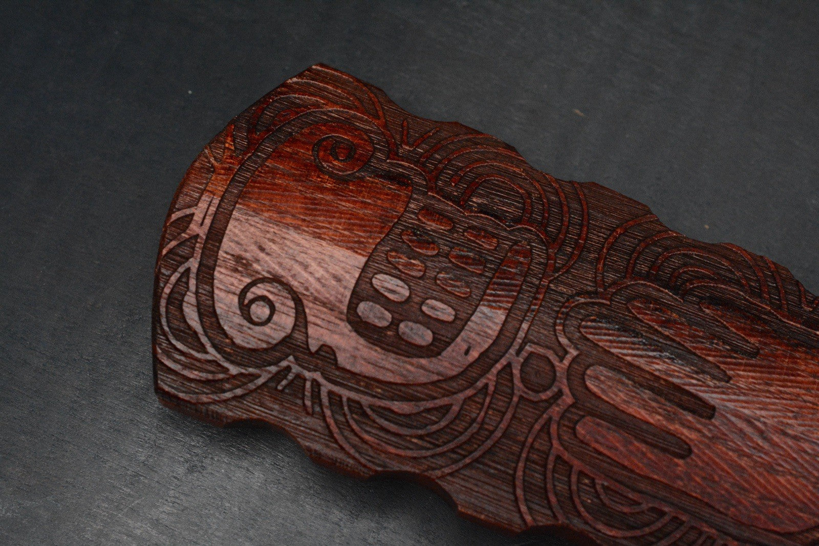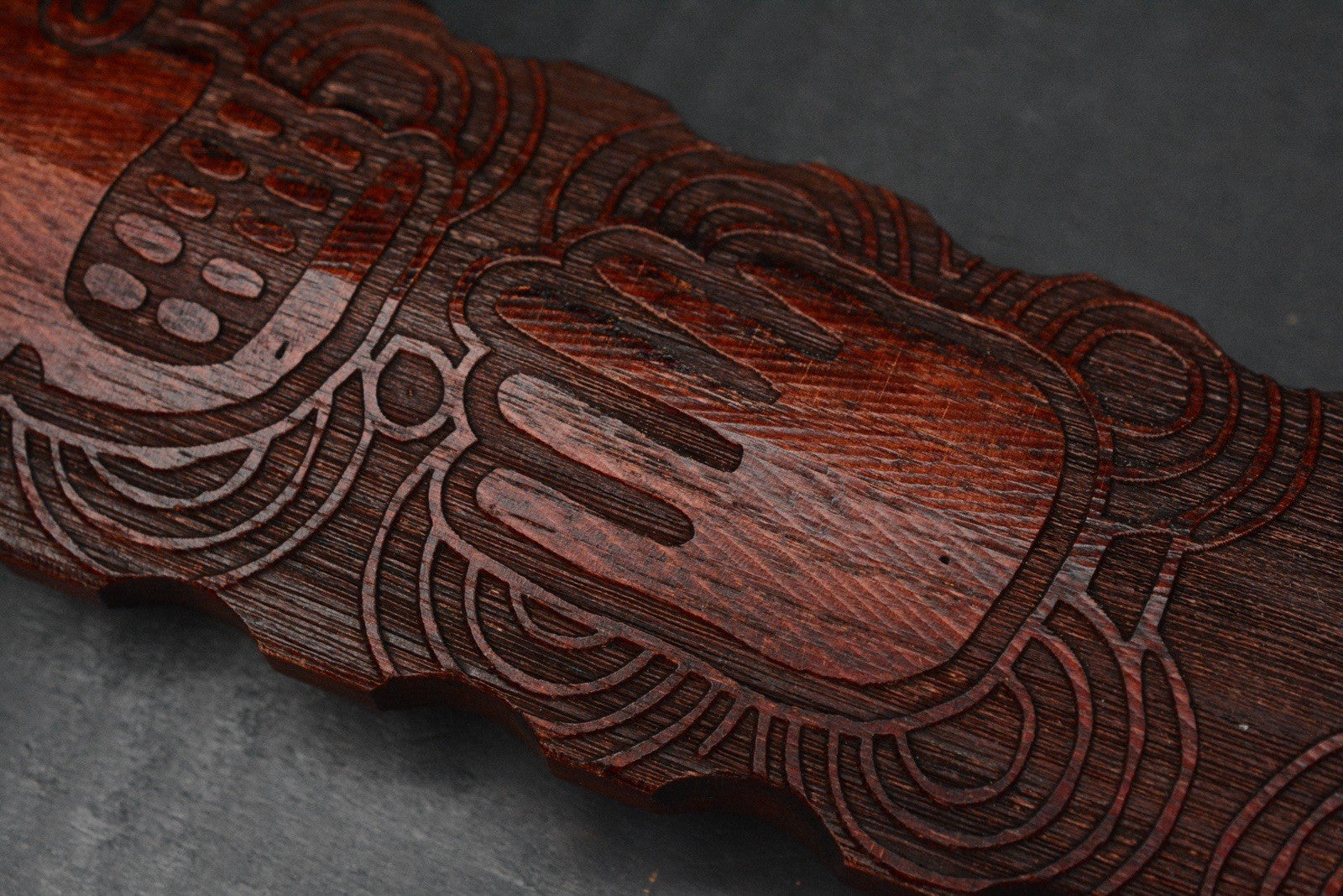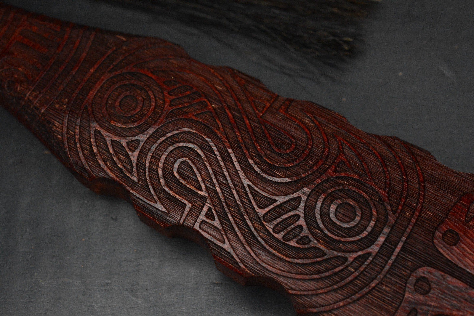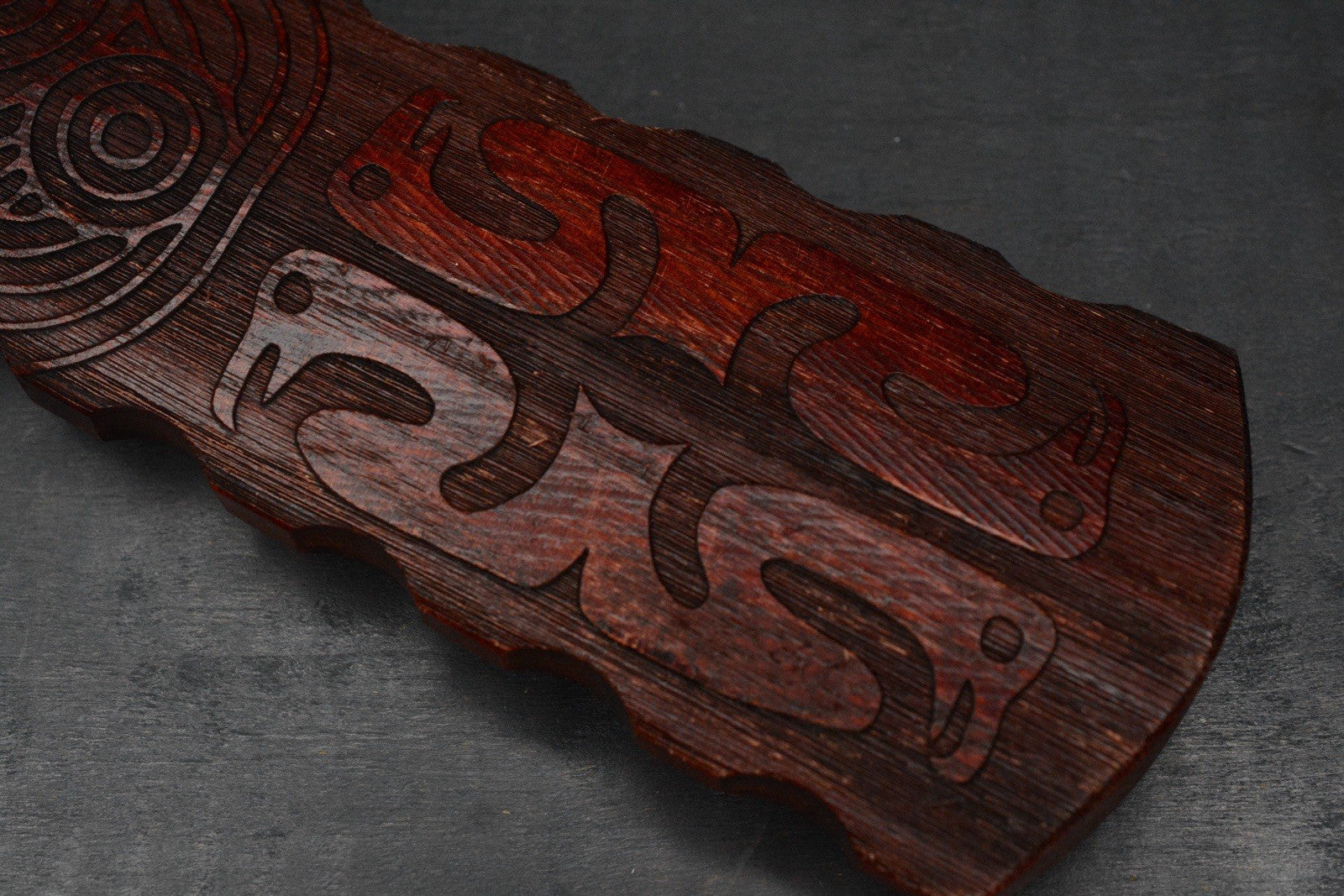 Straight from Ryan's shop is his War Stick, similar to the Macuahuitl (don't ask us how to pronounce it) war club coming in at 16.5 inches long! Perfect for all your smashing and bashing needs, his War Stick is constructed from Hickory with a Death Cult motif down the body and given a natural finish. The main body tapers to a more than generous handle with a pommel for a secure grip with ornate beads. These War Sticks are not for the feint of heart!