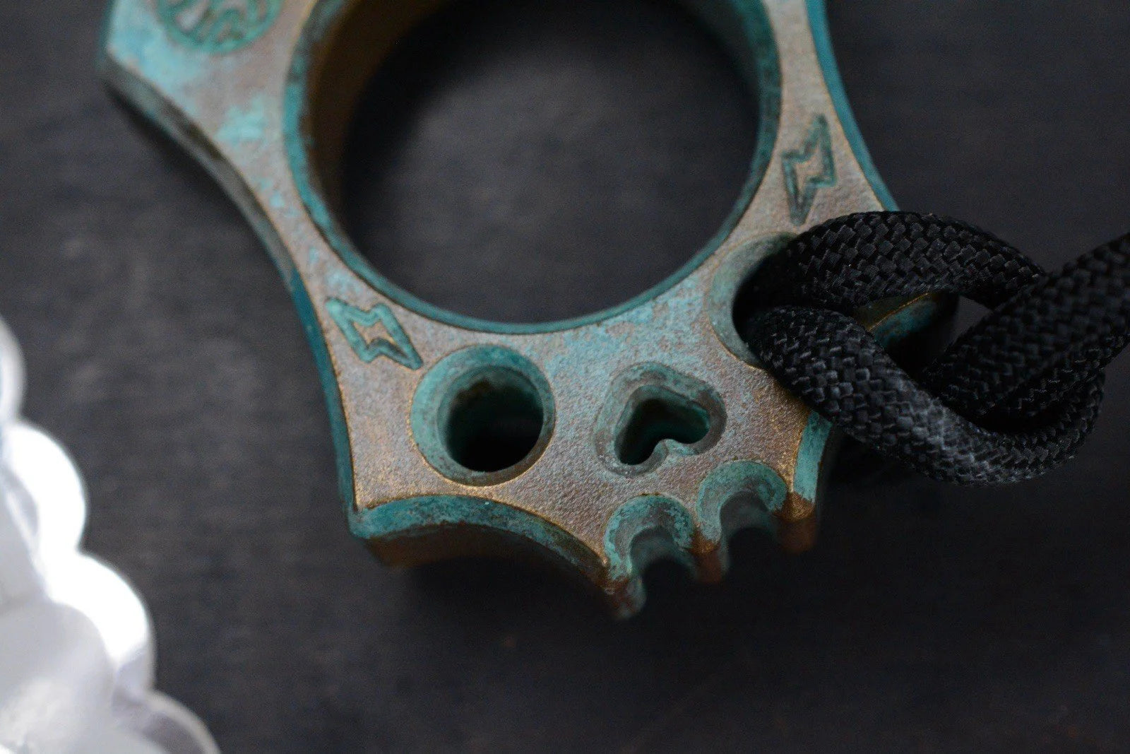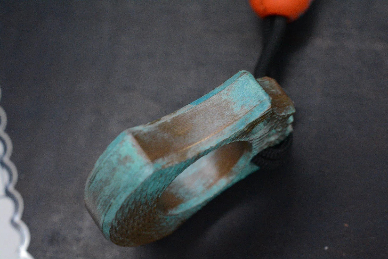 Finished with a heavy bead blast and a forced patina that gives this Bonehead a really cool, ancient look...almost like it's been at the bottom of the sea for a couple centuries. Dark in some areas and bright in others with a realy cool naturally aged turquoise patina, each one is a little unique. These will patina even more with age.