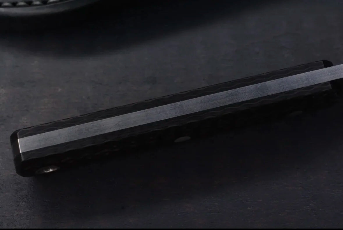 Purple and black Crazy Fiber scales with Black G10 Liners, stainless corby bolts and tube. The blade is sandblasted.