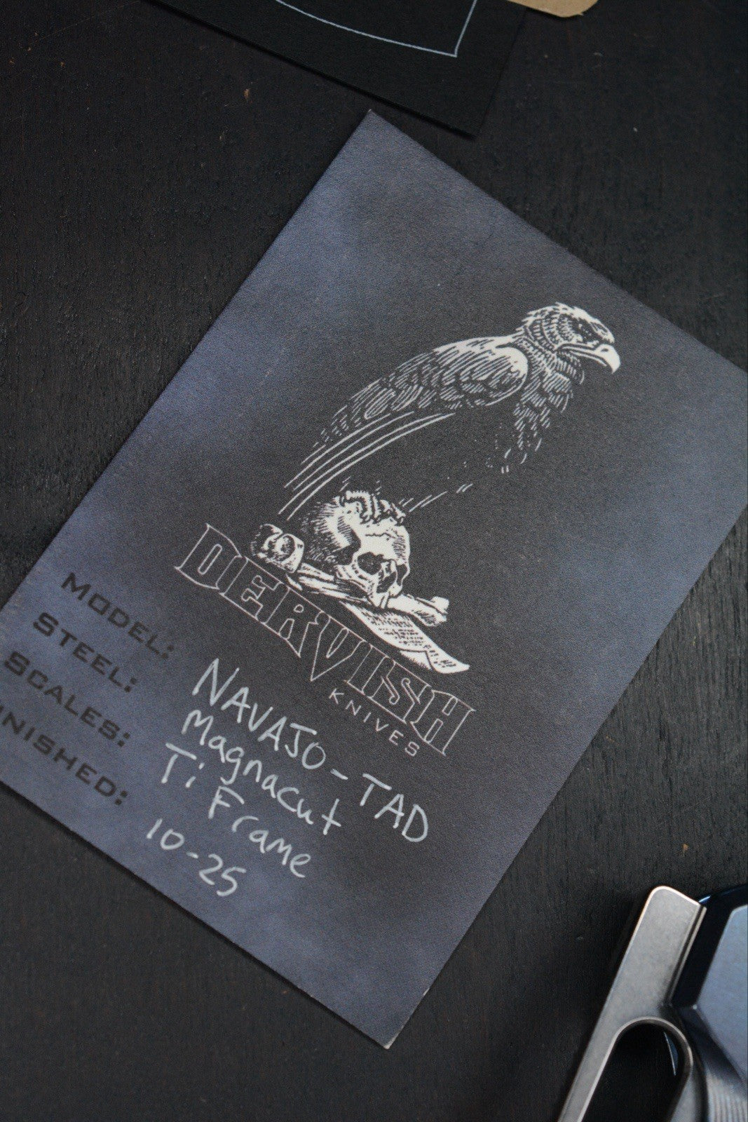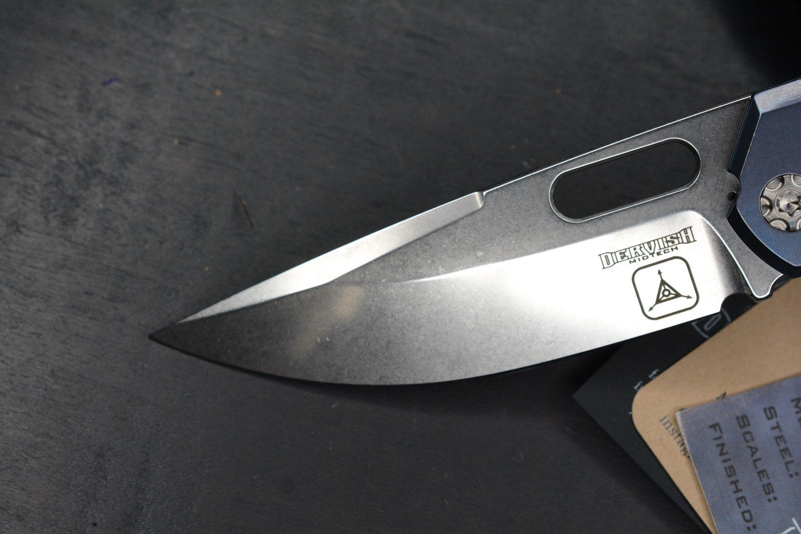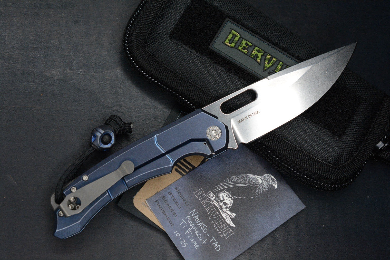 An oversized thumb cutout paired with Skiff bearings assures swift and positive deployment and the hardened steel inserts promise years of hard use. The titanium frame lock assures the blade stays locked in place until the task is done. Finishing touches include a heavily jimped titanium backspacer, custom titanium pivot, and a Lynch Northwest clip. Dervish and TAD logos are at the base of the blade.