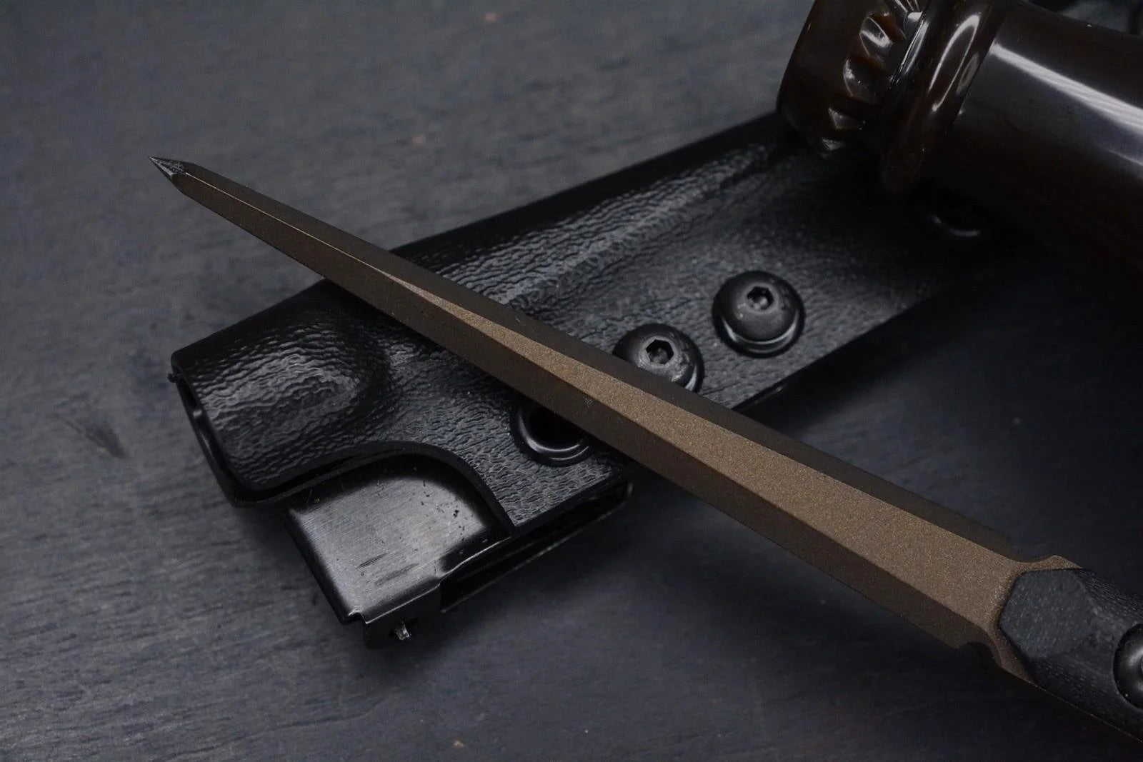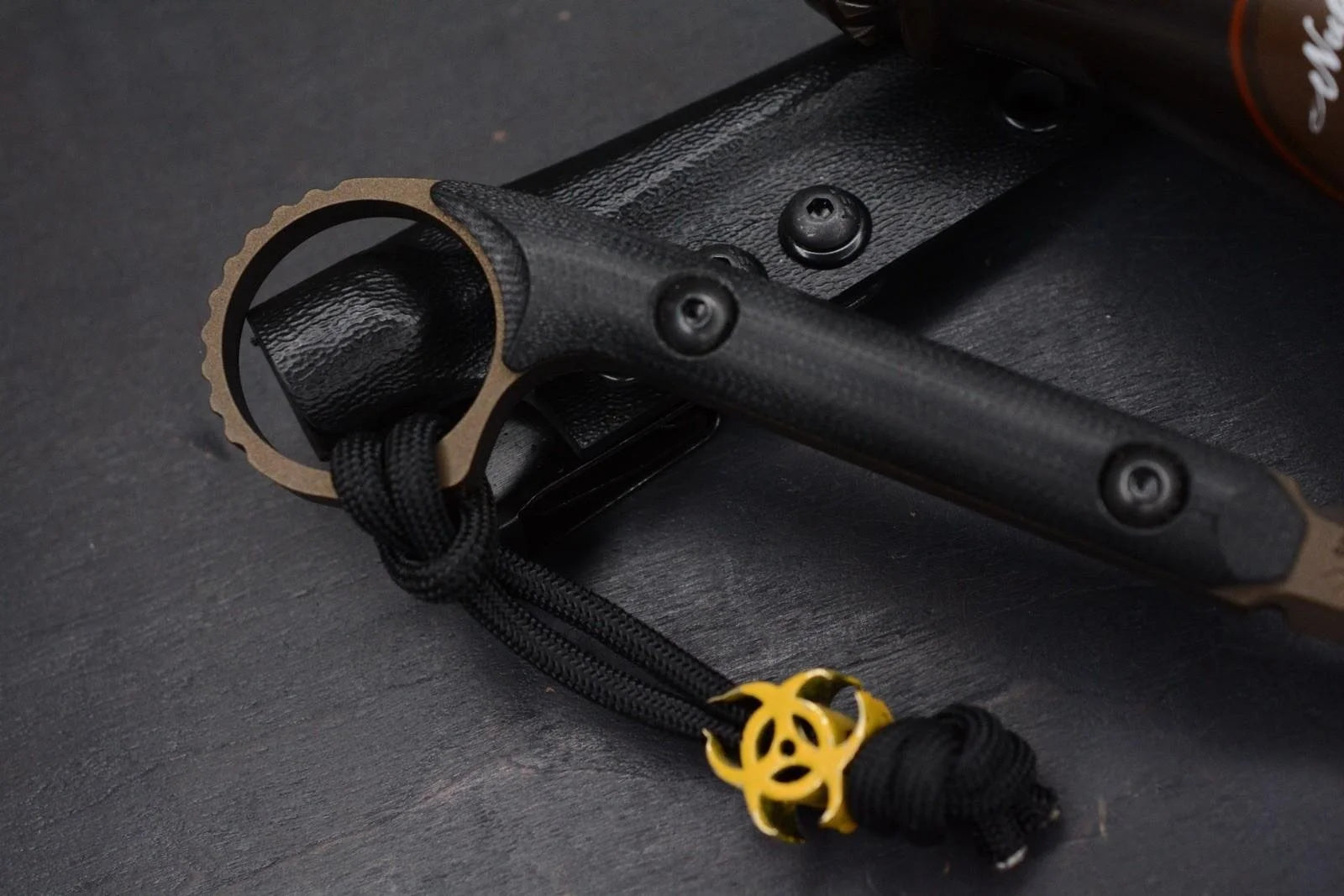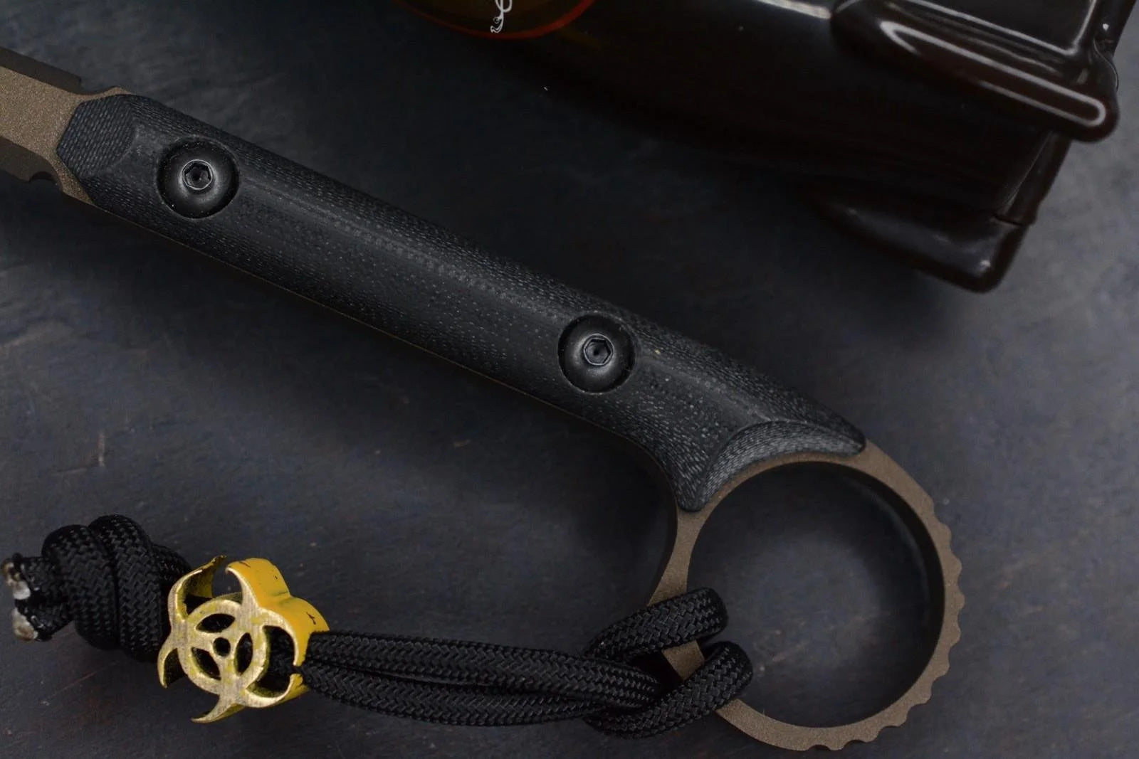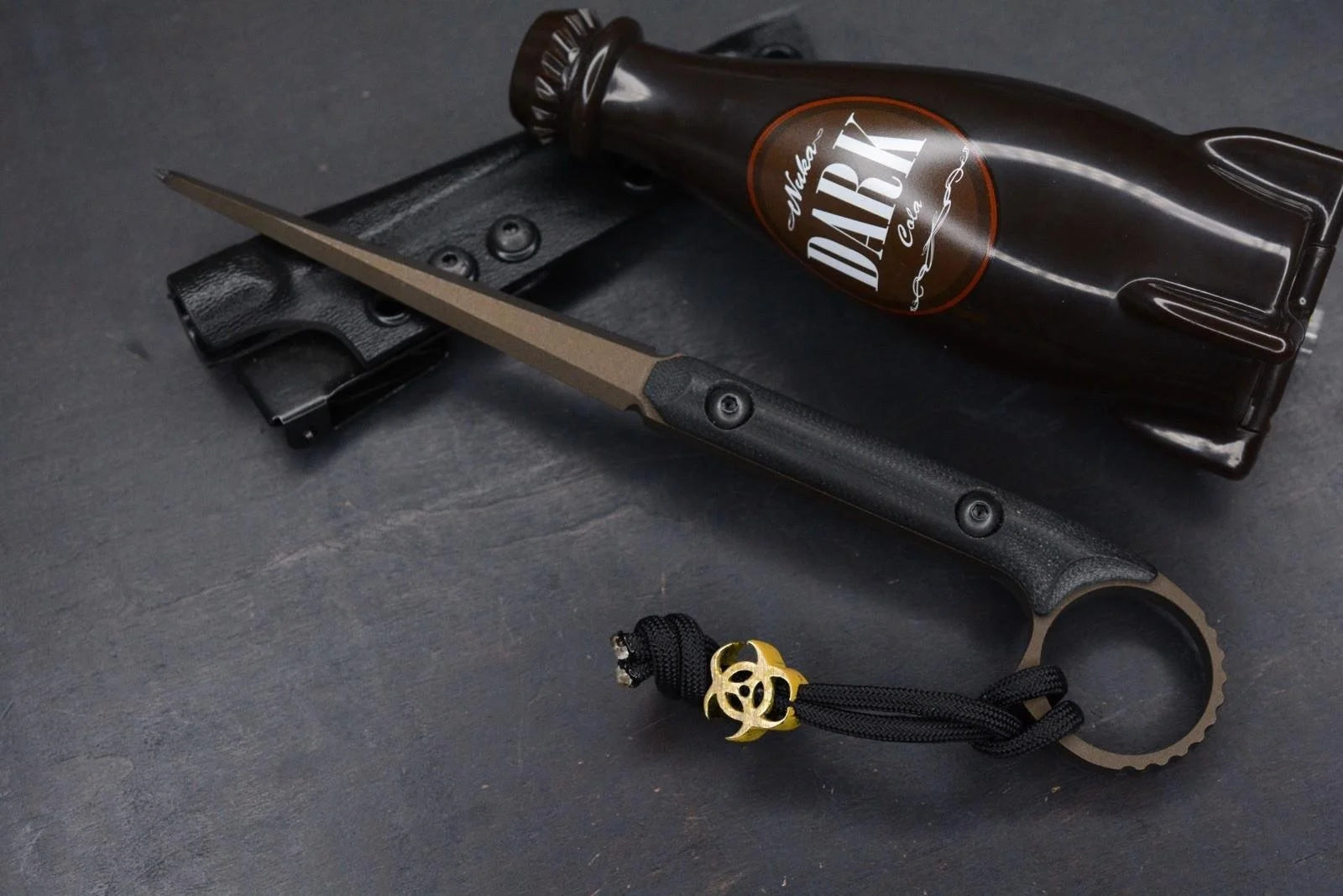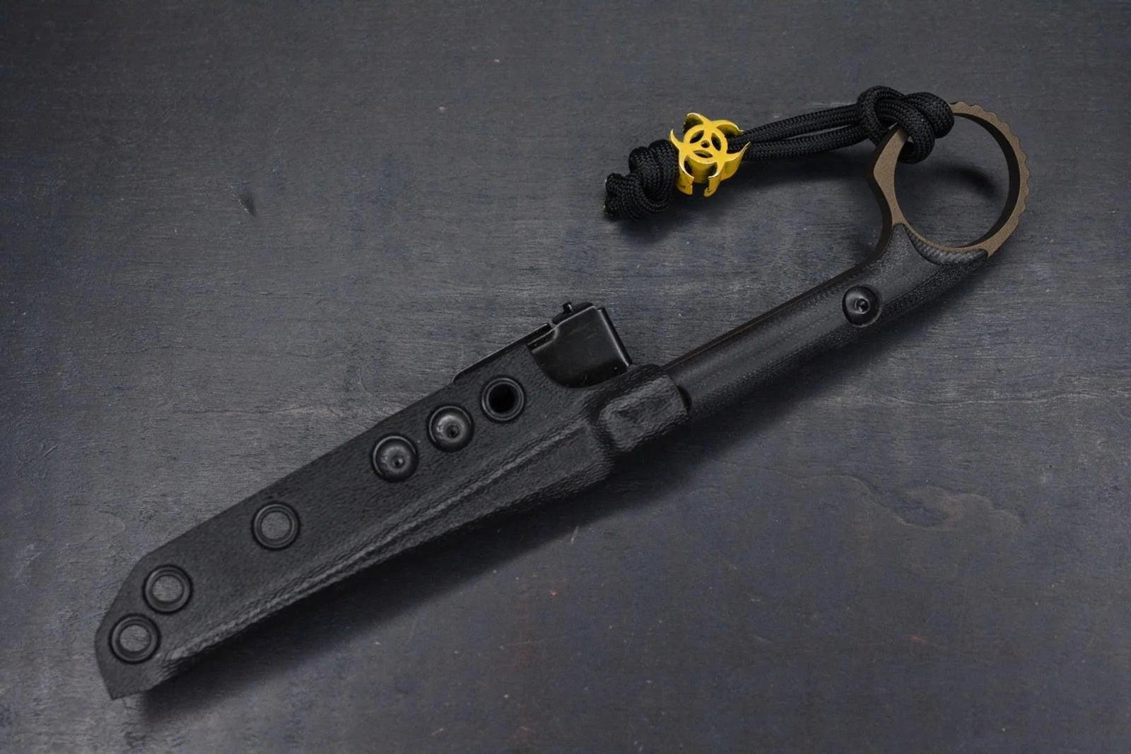 This Ringed Cardiac Spike by Half Face blades. Has a slate green cerakoted blade with G-10 scales. Comes with kydex sheath with ulticlip.