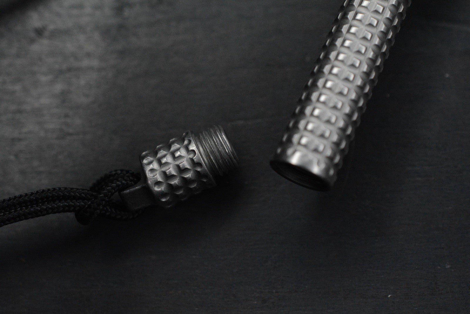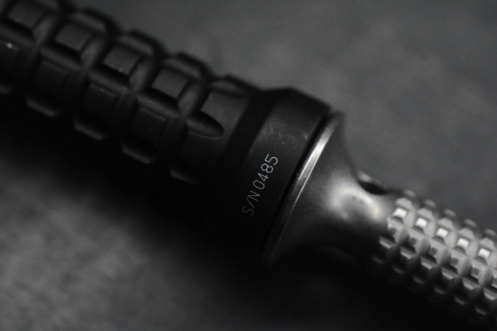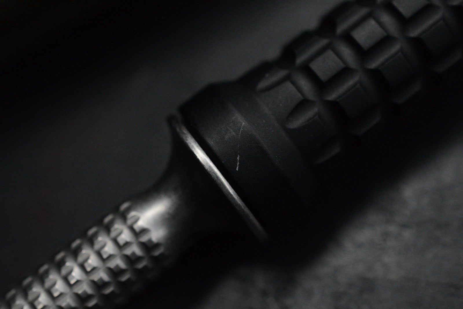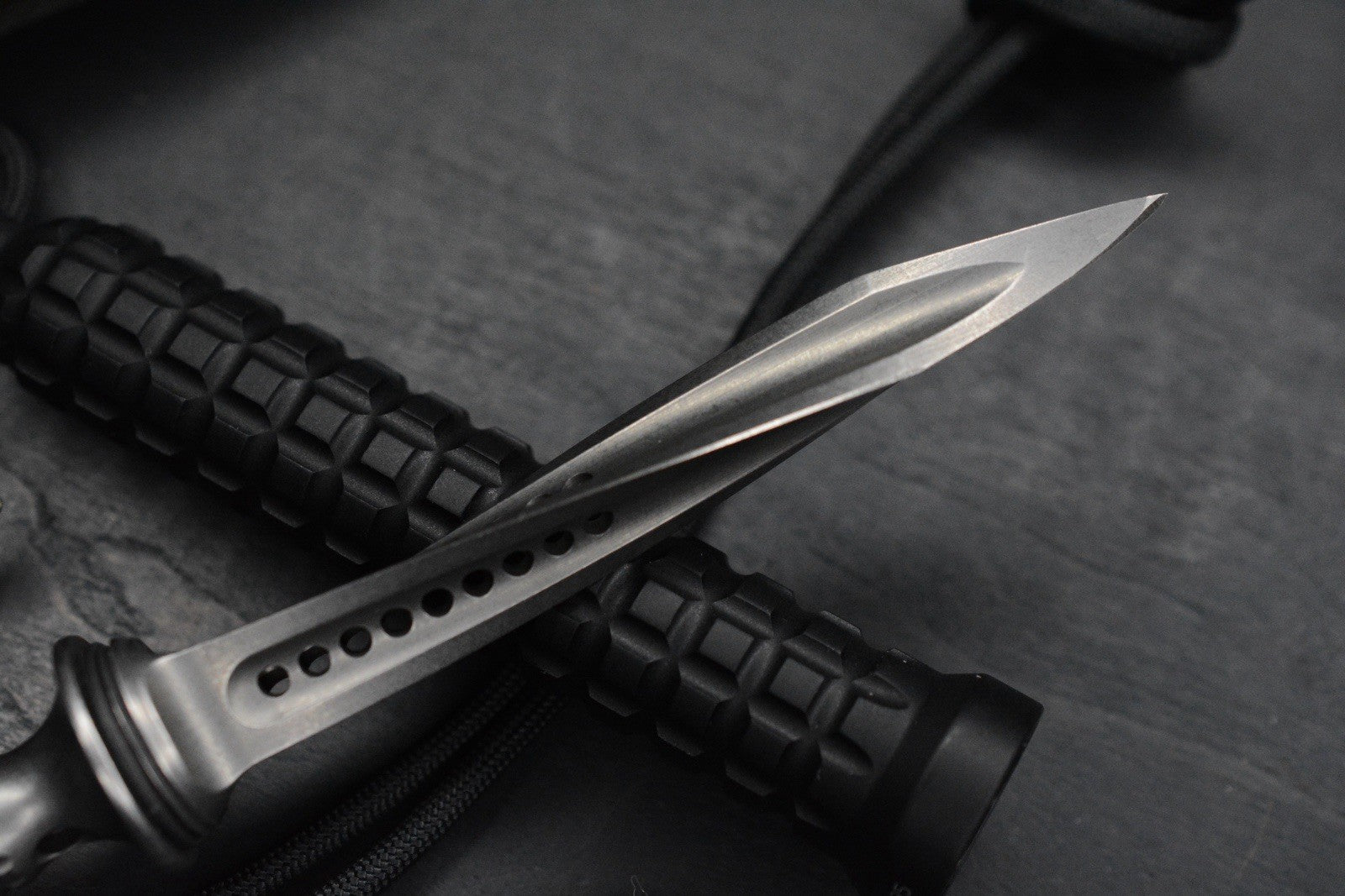 The Microtech Jagdkommando is an awesome feat of engineering taking its name from the Austrian Armed Forces Special Operations group. This fixed blade was milled from one solid piece of aluminum in the way you might expect Microtech too,.. it has three edges. The handle and sheath both feature waffle textured grips and are threaded, because the only way to remove or insert the knife is to screw it into the sheath.