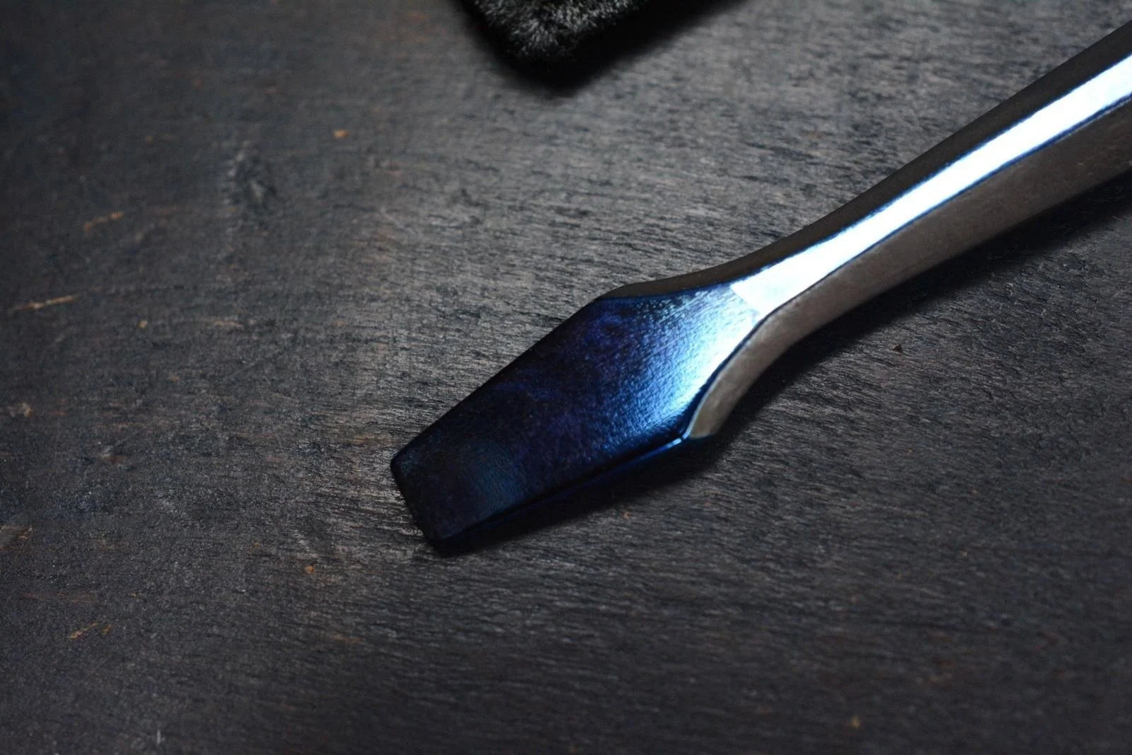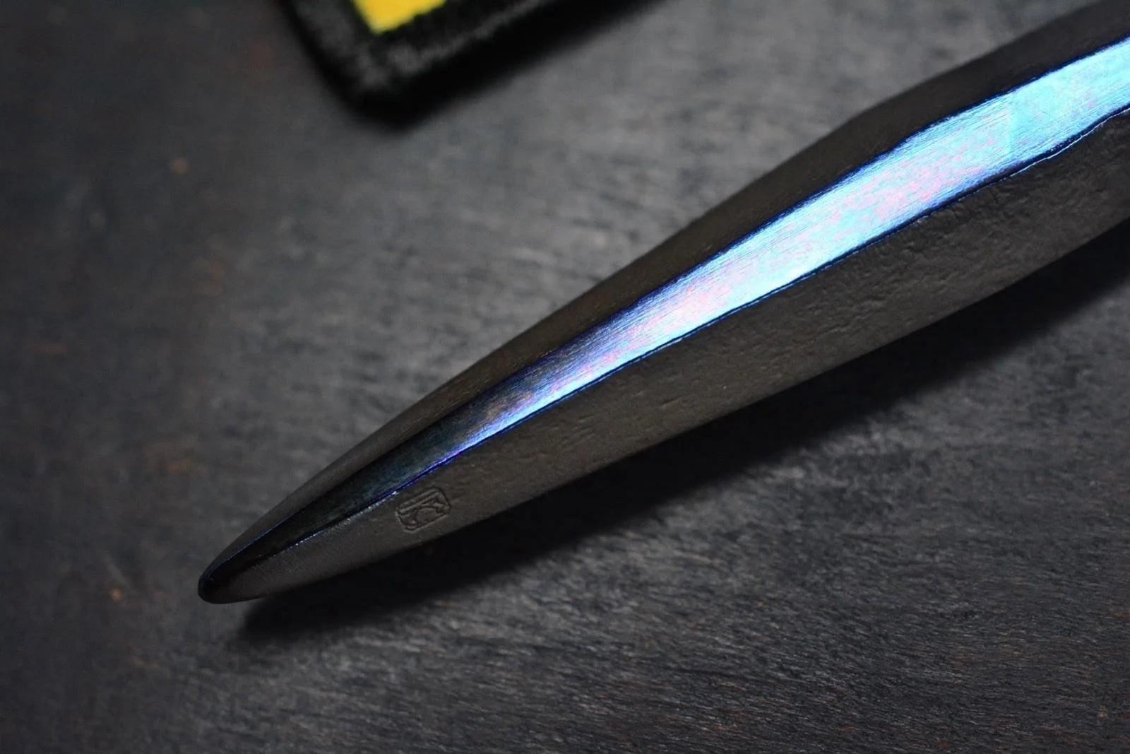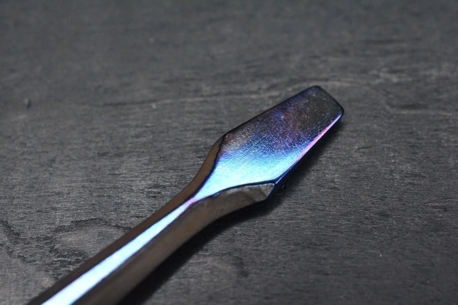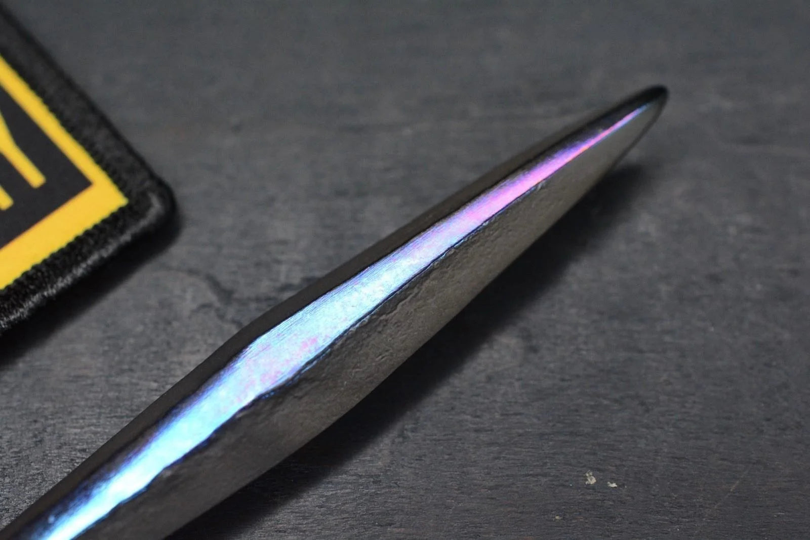 Hand forged from 1/2"dia Grade 5 Titanium round bar. They have polished and heat flamed flats for a unique blue/purple accent.