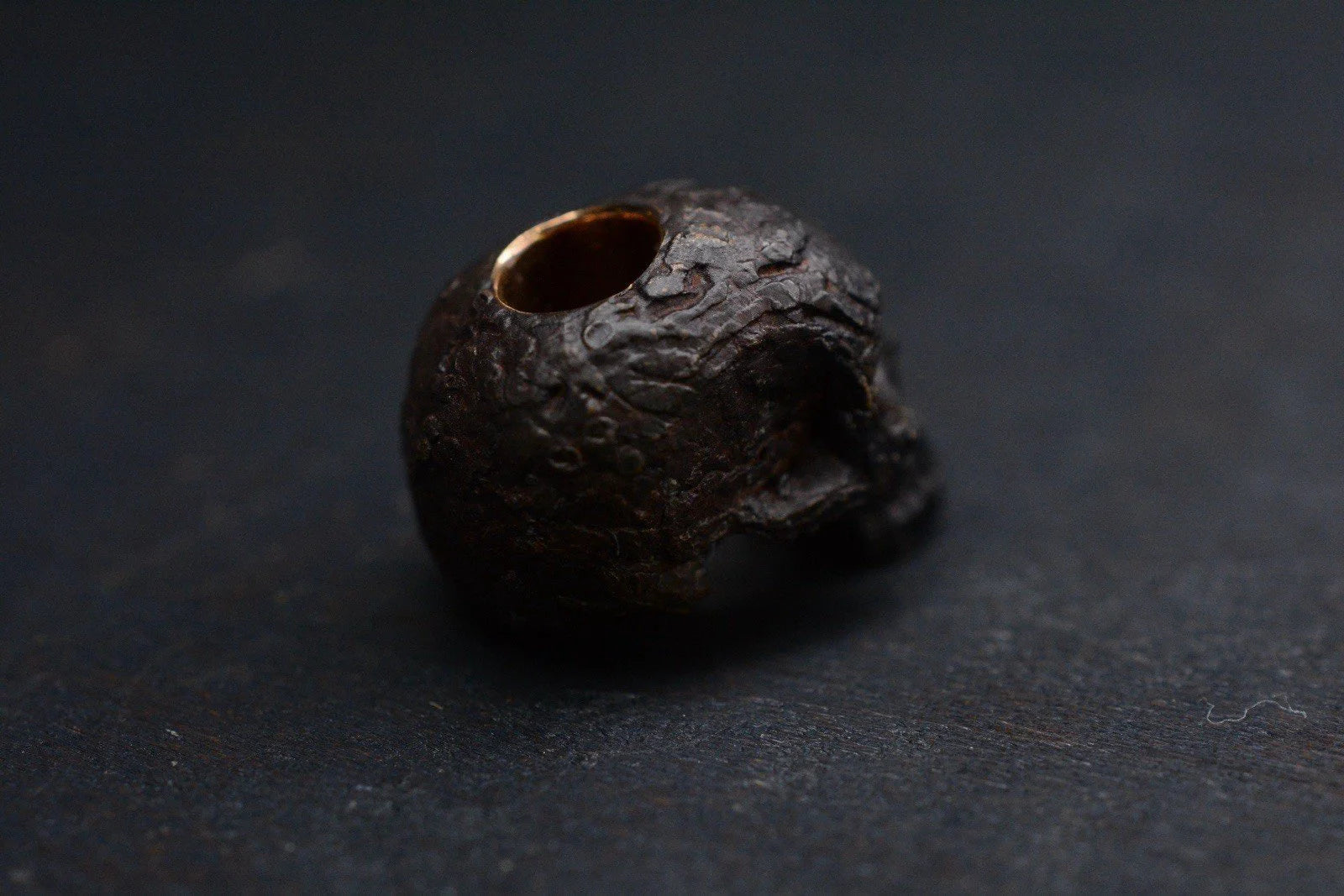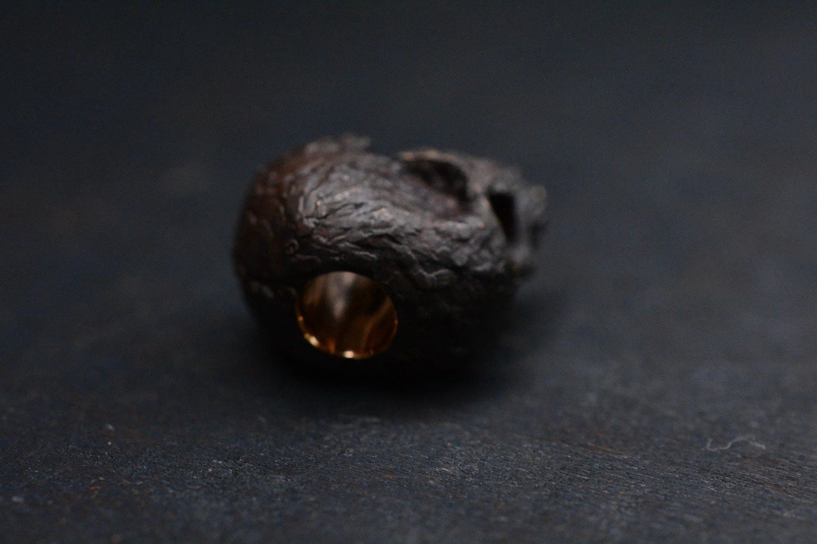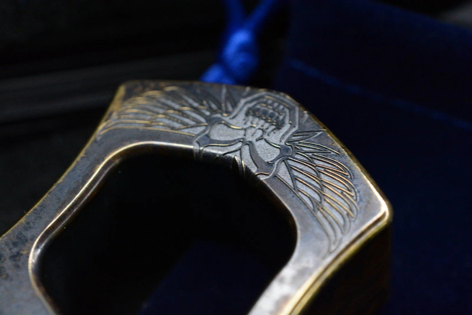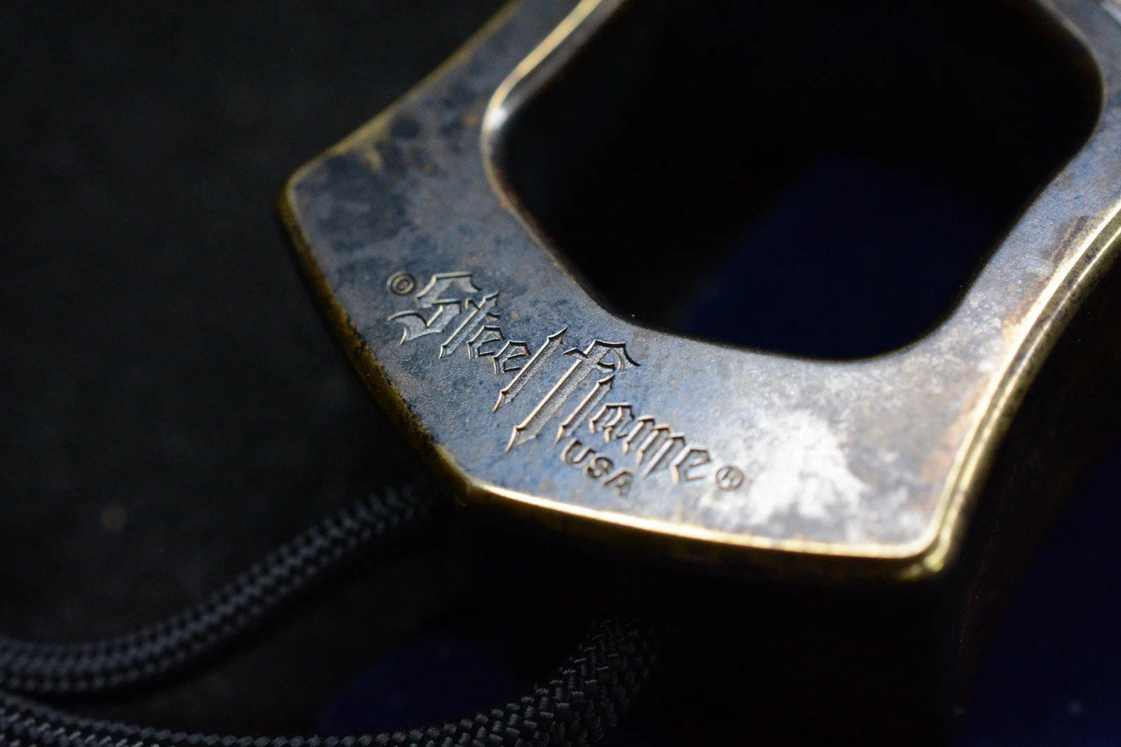 This XXXL Brass Sledge Ring from Steel Flame is 3/4" thick, has the Hardness Wings pattern on front and rear. Finished with Steel Flame's Case Hardened Vintage Gunmetal finish. Excellent condition.