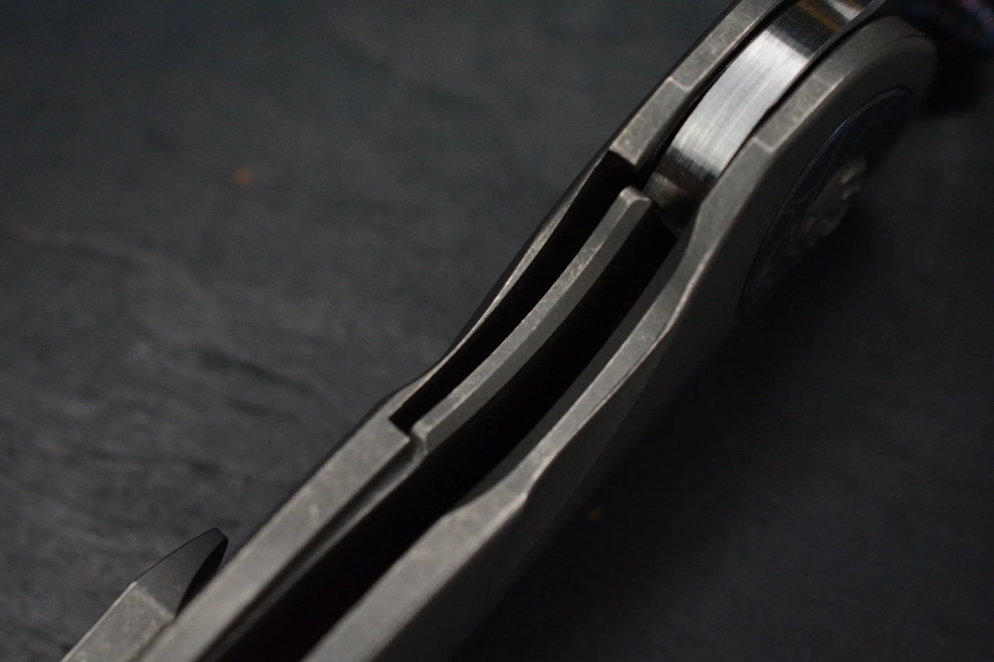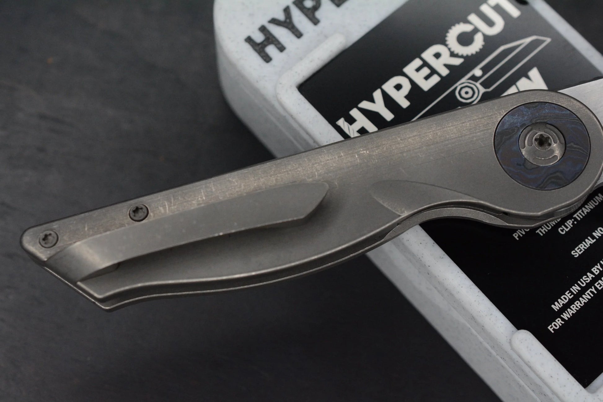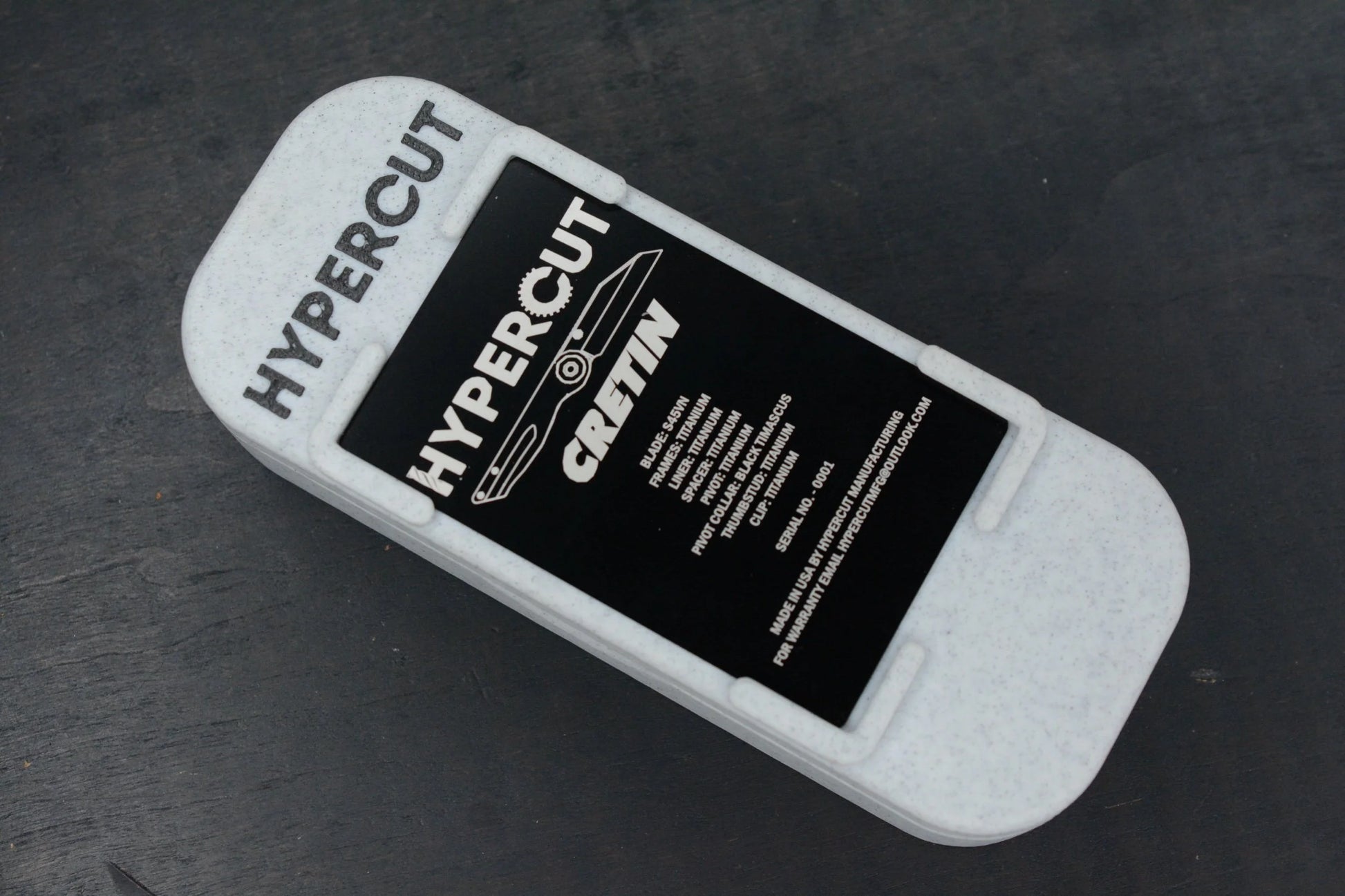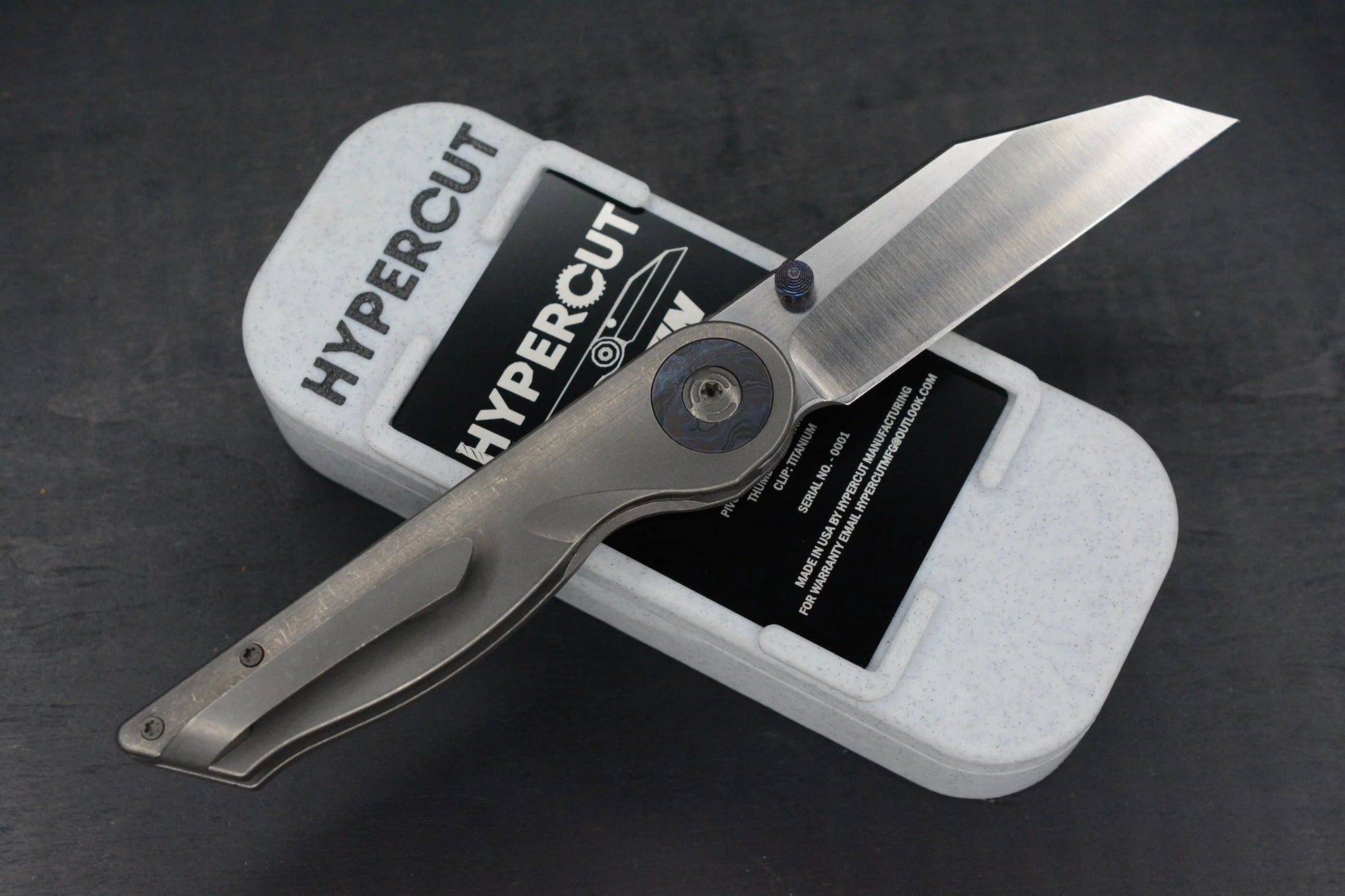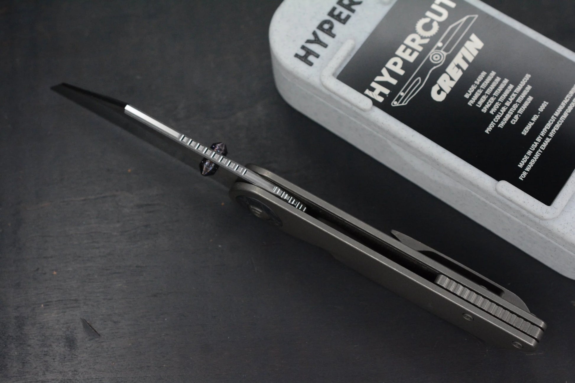 The very first Hypercut Cretin created. This SN 0001 Hypercut Cretin is an iconic piece for serious collectors or a phenomenal starter collector piece. This extraordinary knife is of all titanium construction with a black timascus pivot collar and Hypercut added timascus thumbstuds.This is a hand ground S45VN blade with a really cool finish that is like a stonewash then belt satin.